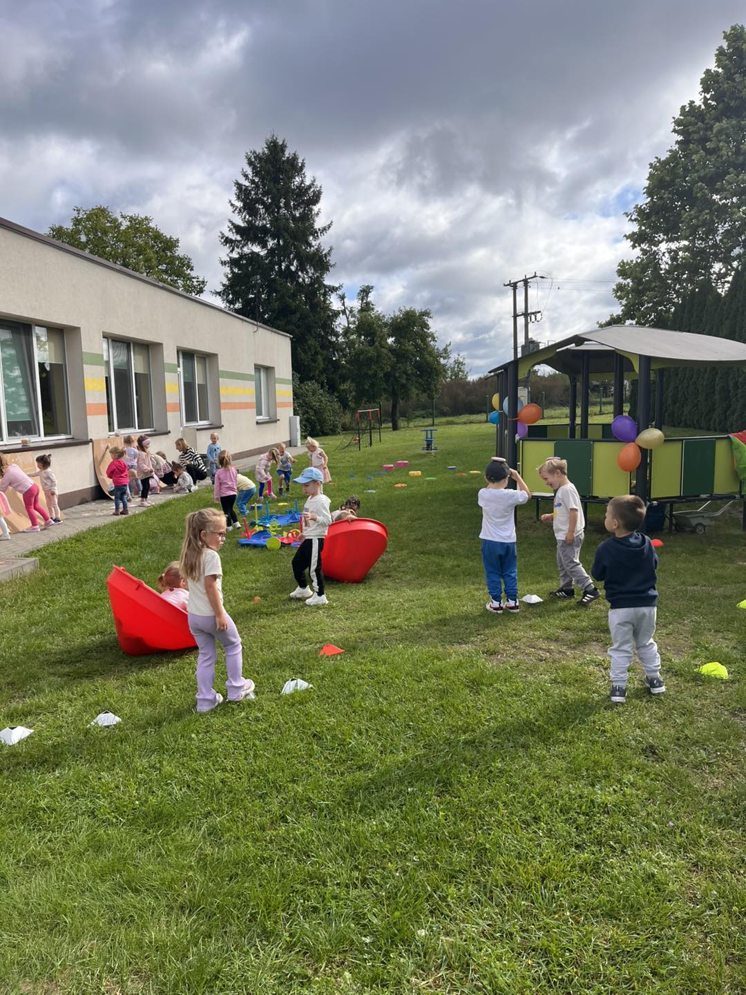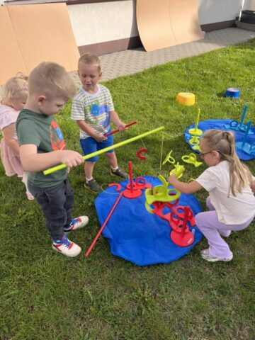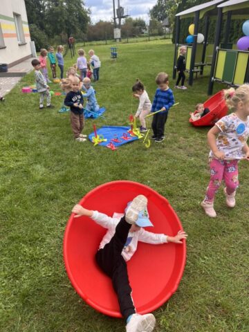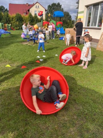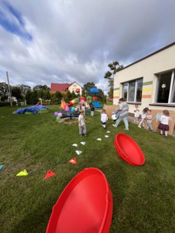 Nie zabrakło także toru przeszkód, który sprawdził naszą zwinność i odwagę, a podczas zabaw równoważnych dzieci uczyły się koncentracji i utrzymywania równowagi. Było też dużo muzyki, tańców i śmiechu! 🎶🕺💃