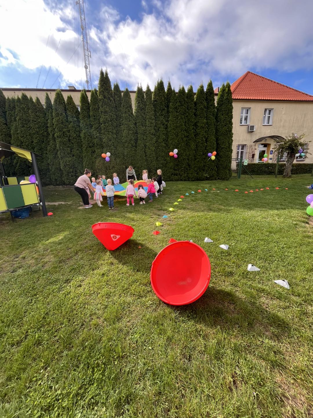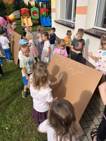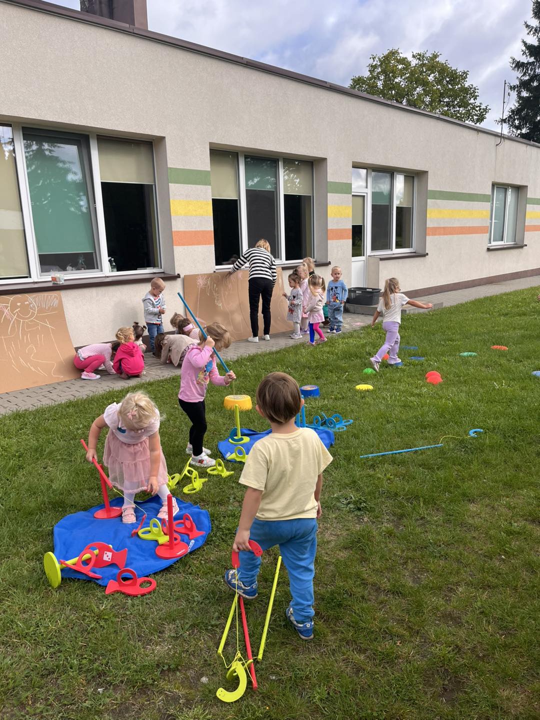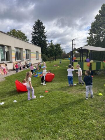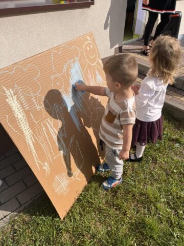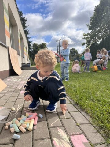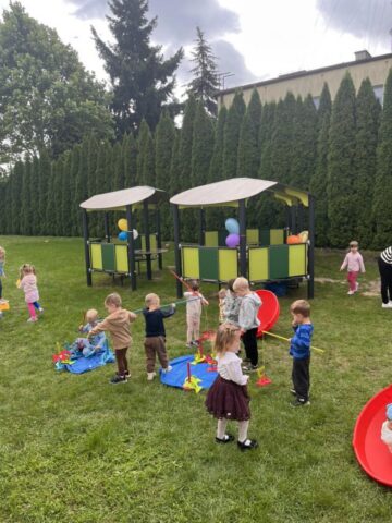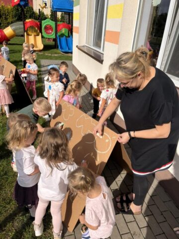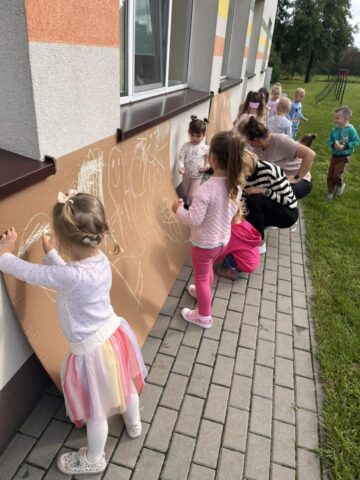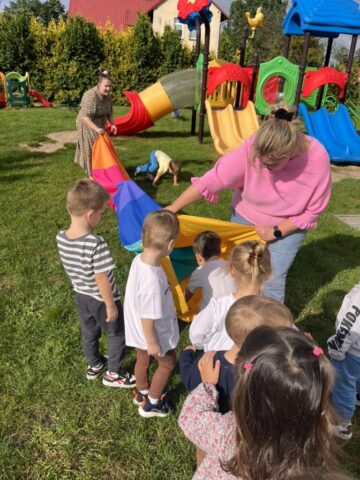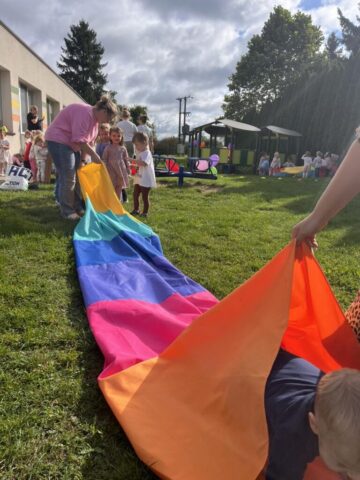 Na dzieci czekało mnóstwo atrakcji – bawiliśmy się na placu zabaw, uczestniczyliśmy w zabawach ruchowych z kolorową chustą animacyjną, tworzyliśmy kredowe arcydzieła, a zabawy sensoryczne pobudziły wszystkie nasze zmysły! 🎨🖐️