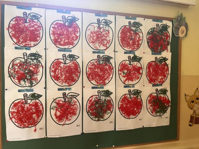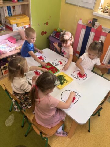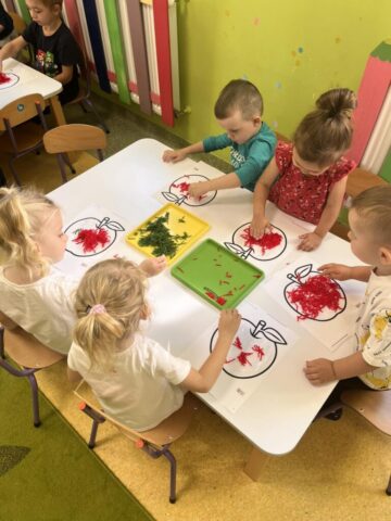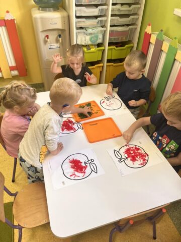 Dzieci z wszystkich grup uczestniczyły w różnorodnych aktywnościach związanych z jabłkiem. W ramach zajęć plastycznych przedszkolaki wykonały kolorowe prace przedstawiające jabłka – malowały farbami, wyklejały papierem kolorowym oraz pracowały z wełną 🧶.