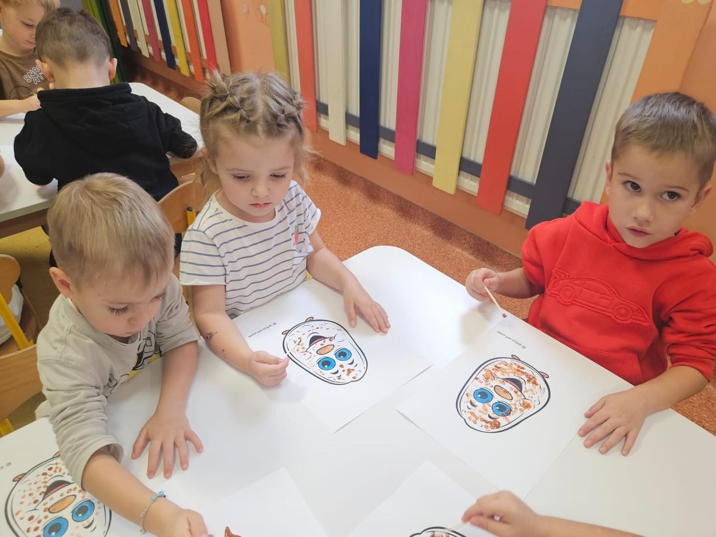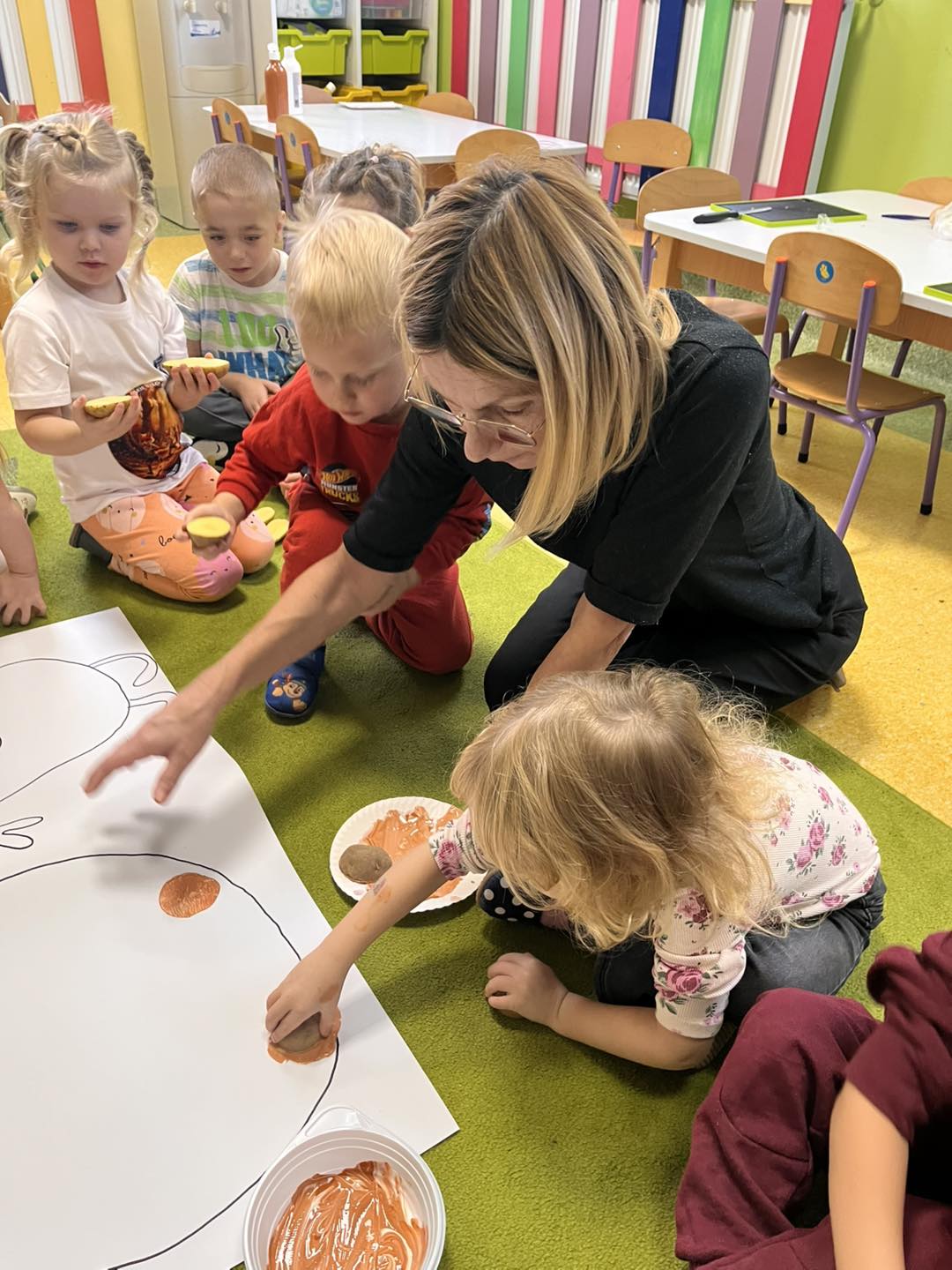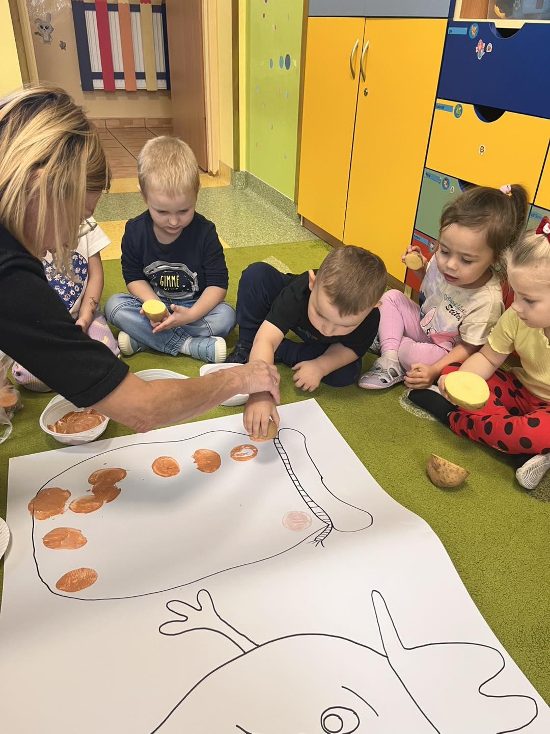 Podczas zajęć plastycznych 🎨 przedszkolaki tworzyły piękne prace z wykorzystaniem ziemniaków – powstały kolorowe stemple, wesołe ziemniaczane ludki i jesienne kompozycje. Nie zabrakło również zajęć matematycznych ✖️➕, podczas których dzieci przeliczały ziemniaki, porównywały ich wielkość i kształty, doskonaląc przy tym swoje umiejętności liczenia.