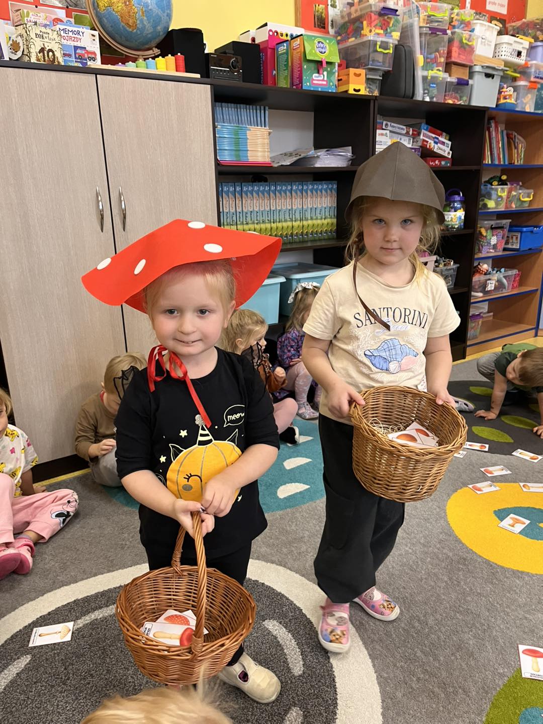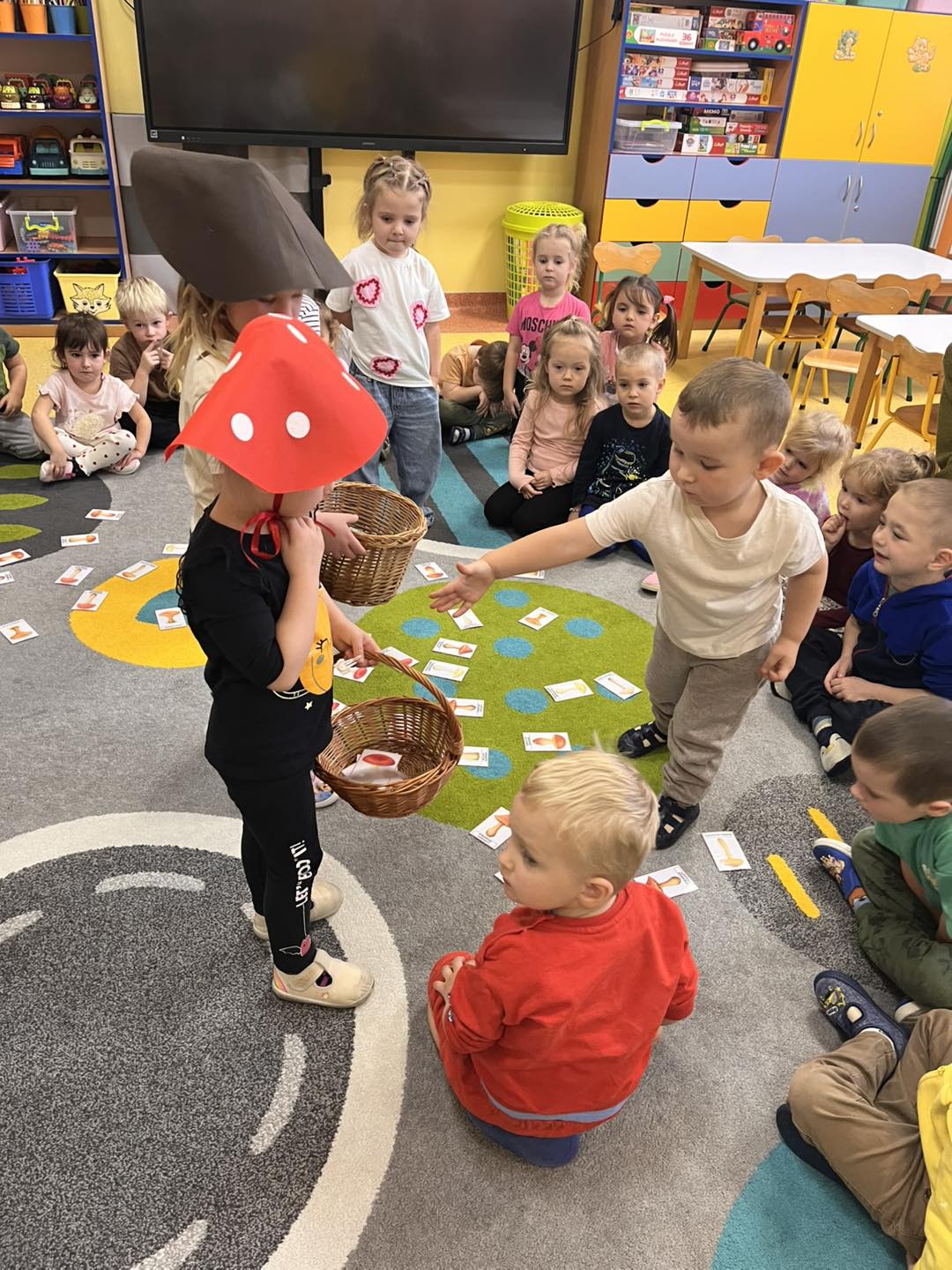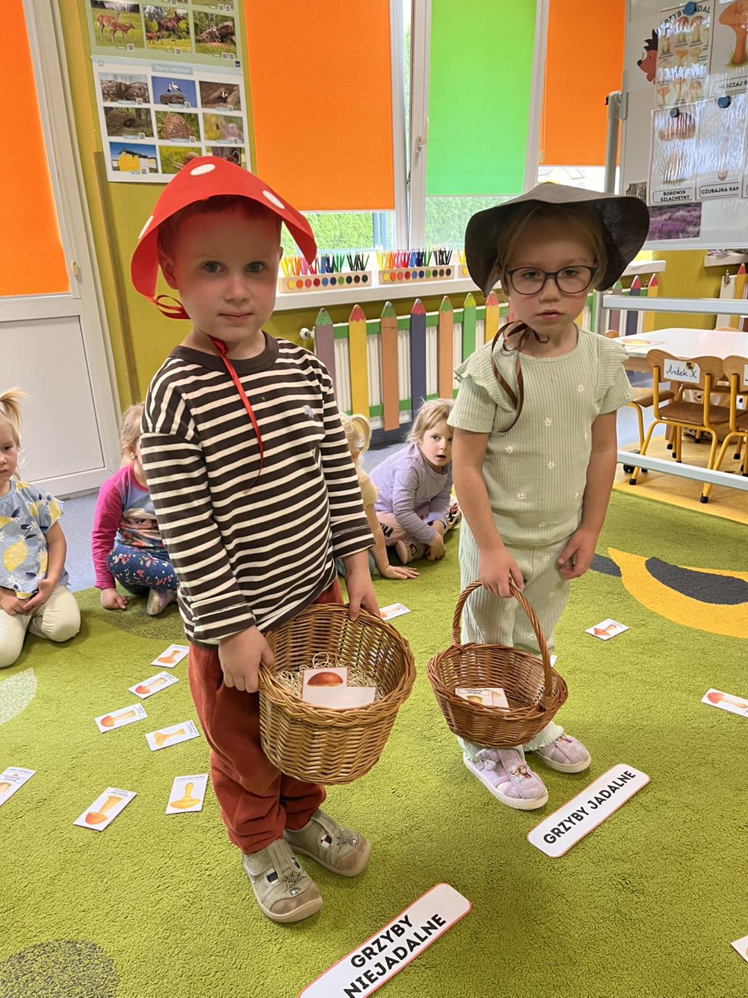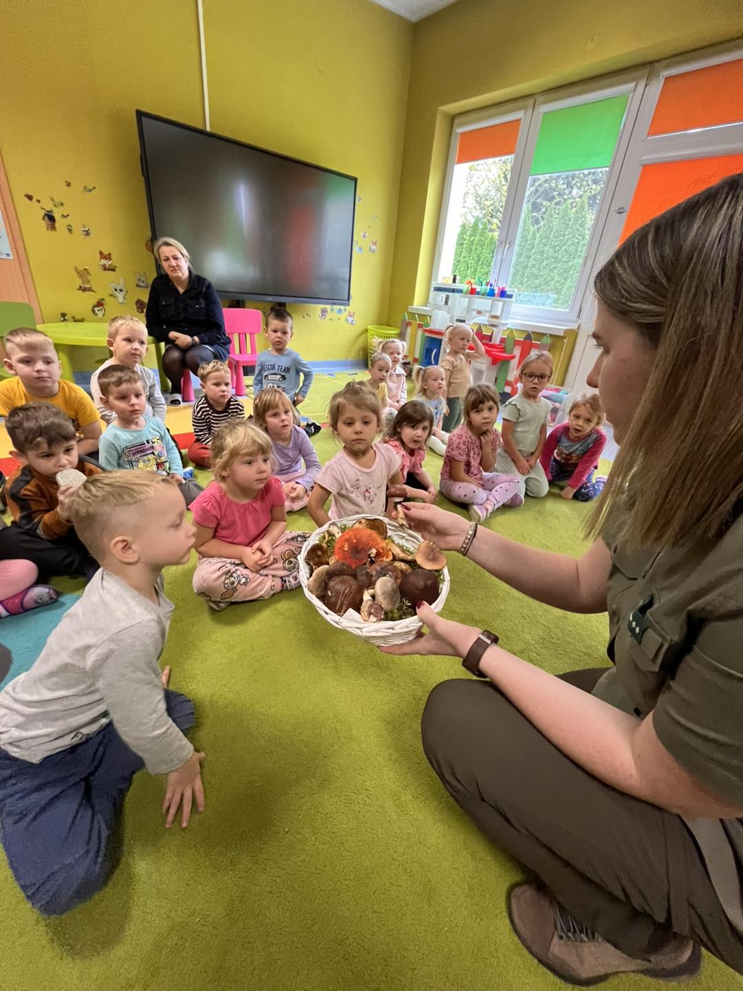 Podczas spotkania przedszkolaki dowiedziały się, jakie grzyby rosną w naszych lasach – które z nich są jadalne, a które niejadalne i trujące. Dzieci mogły zobaczyć prawdziwe okazy grzybów, posłuchać ciekawostek o ich budowie i znaczeniu w przyrodzie. ![]()