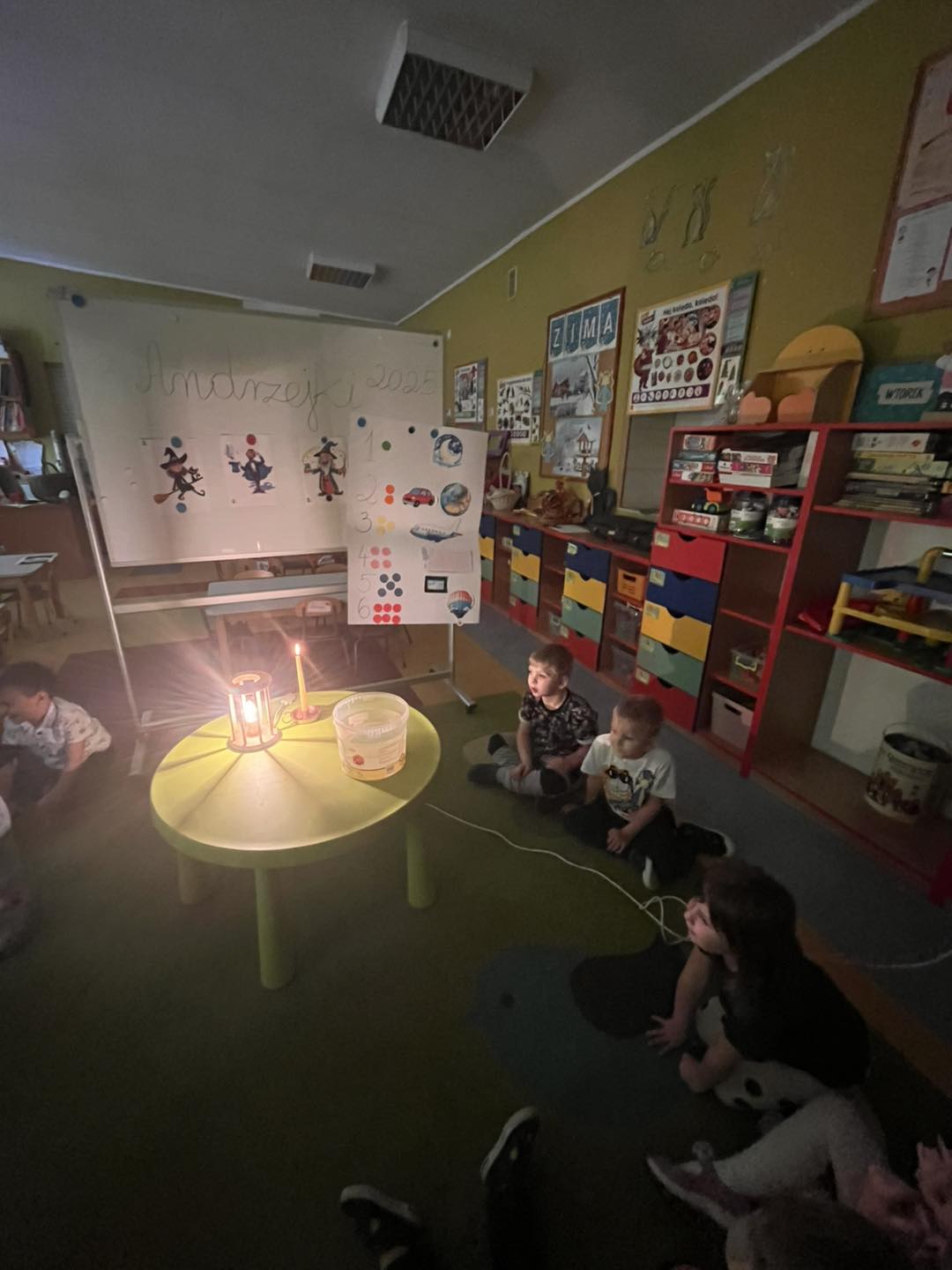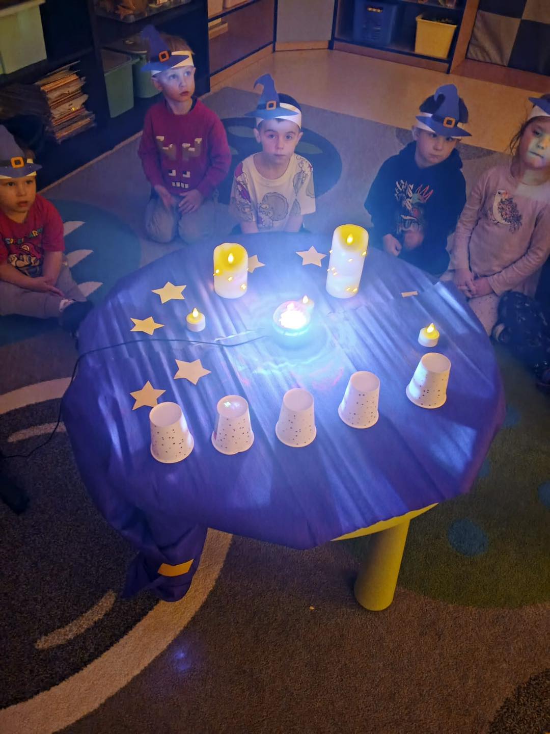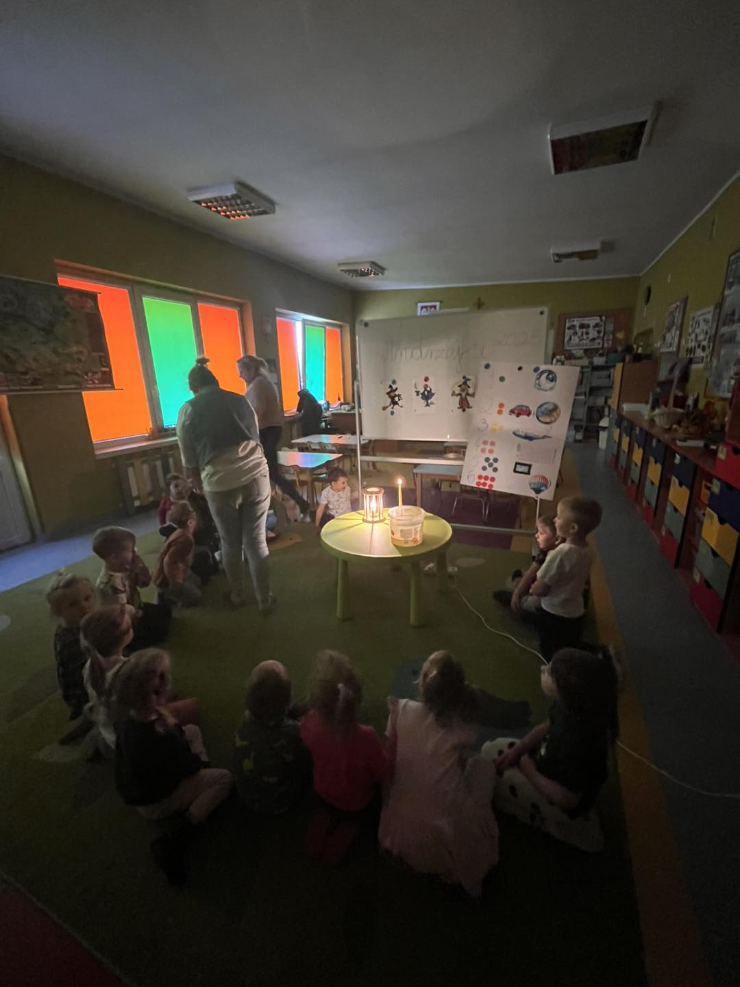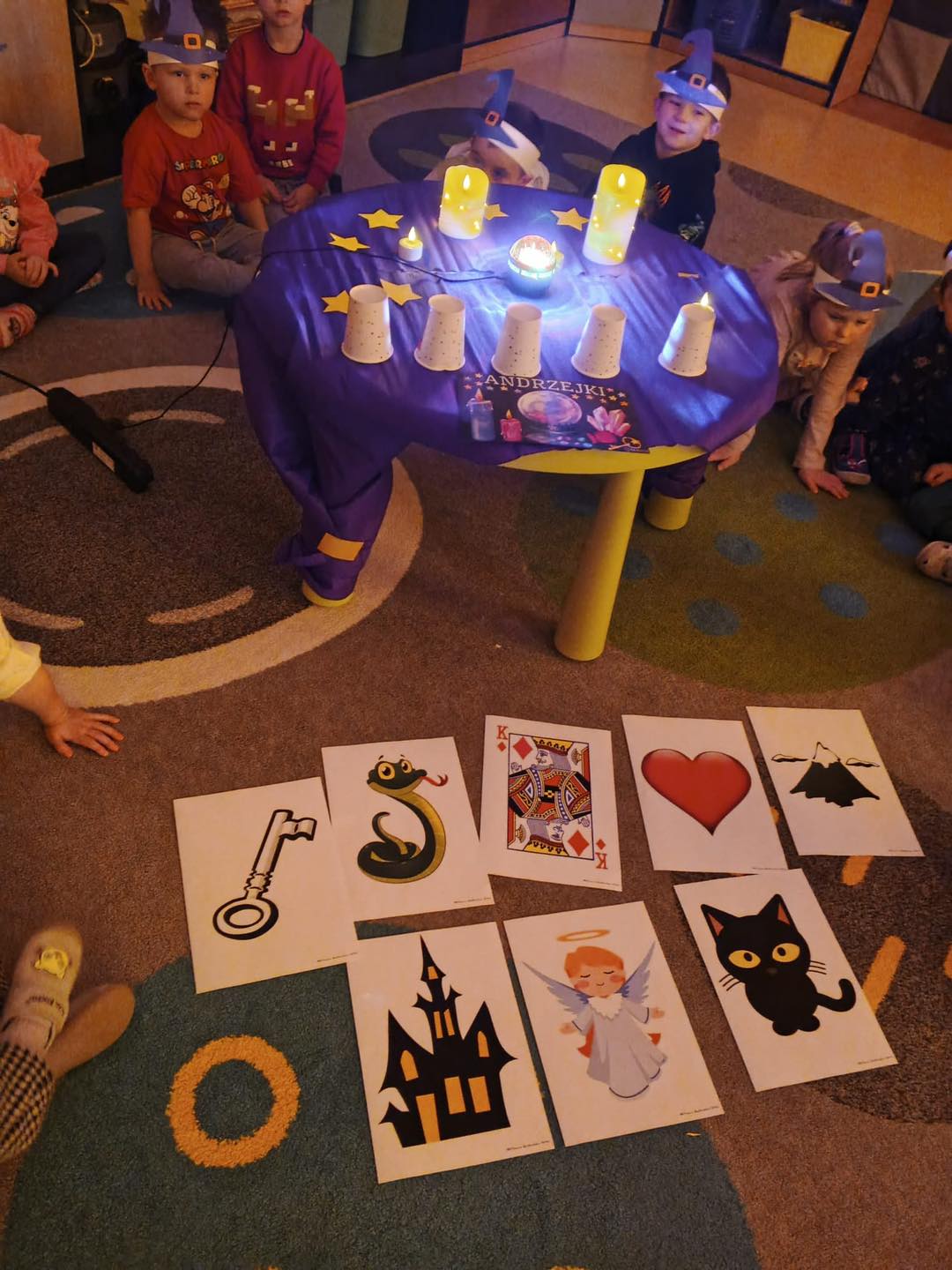 Potem zaczęła się prawdziwa zabawa! 🎉 Przedszkolaki brały udział w najprostszych, specjalnie przygotowanych dla nich wróżbach: laliśmy wosk 🕯️, losowaliśmy karteczki i ustawialiśmy buty 🥿 . Ile było przy tym radości!