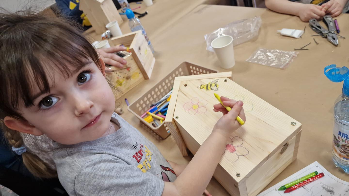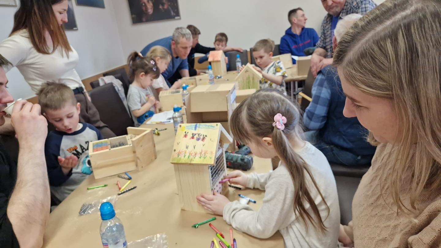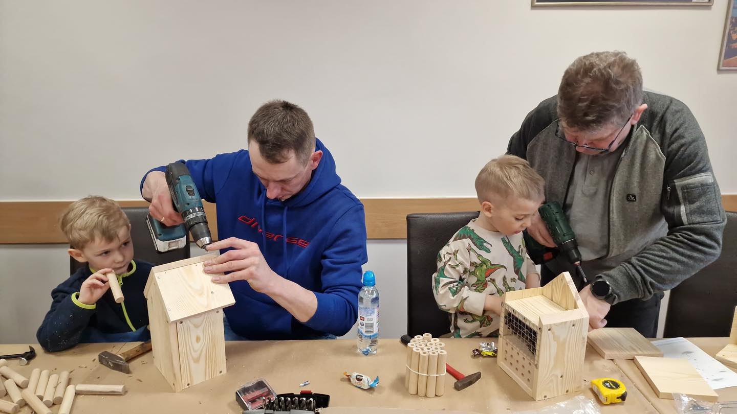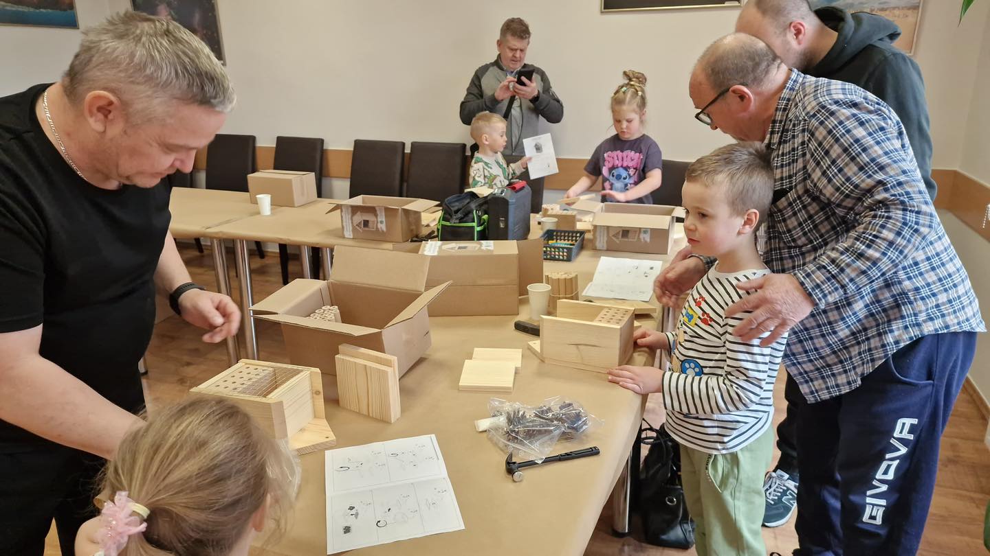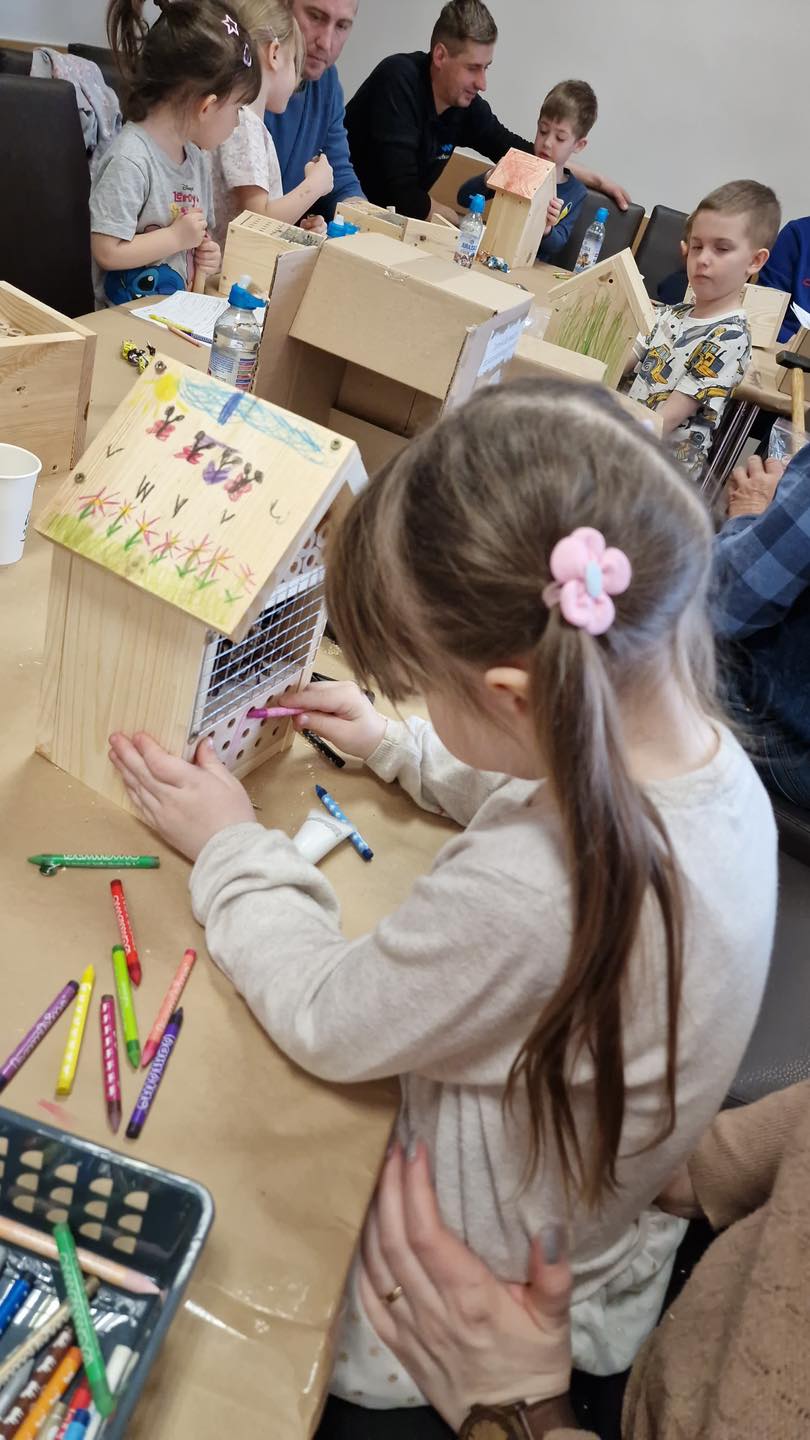 Po części teoretycznej przyszedł czas na działania praktyczne! Dzieci wraz z opiekunami z zaangażowaniem tworzyły domki dla owadów korzystając z narzędzi takich jak wiertarki, wkrętarki i młotki 🔨 . To była nie tylko świetna zabawa, ale też okazja do nauki nowych umiejętności. Powstałe domki zostały pięknie ozdobione i każdy mógł zabrać je do domu 🌿.