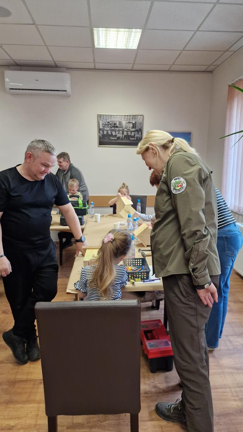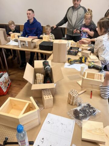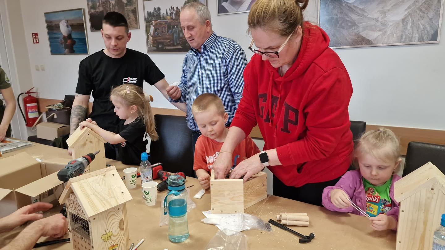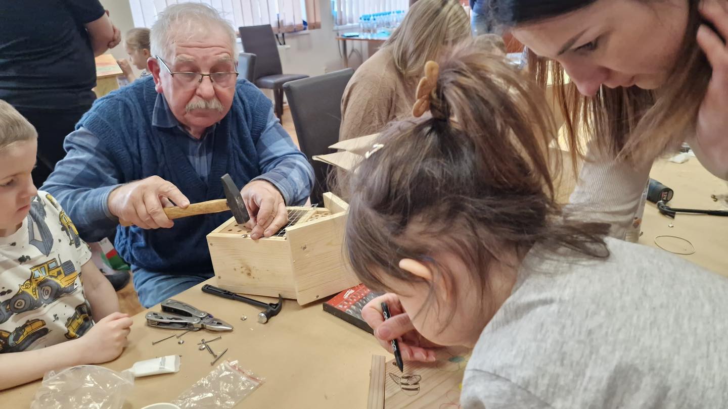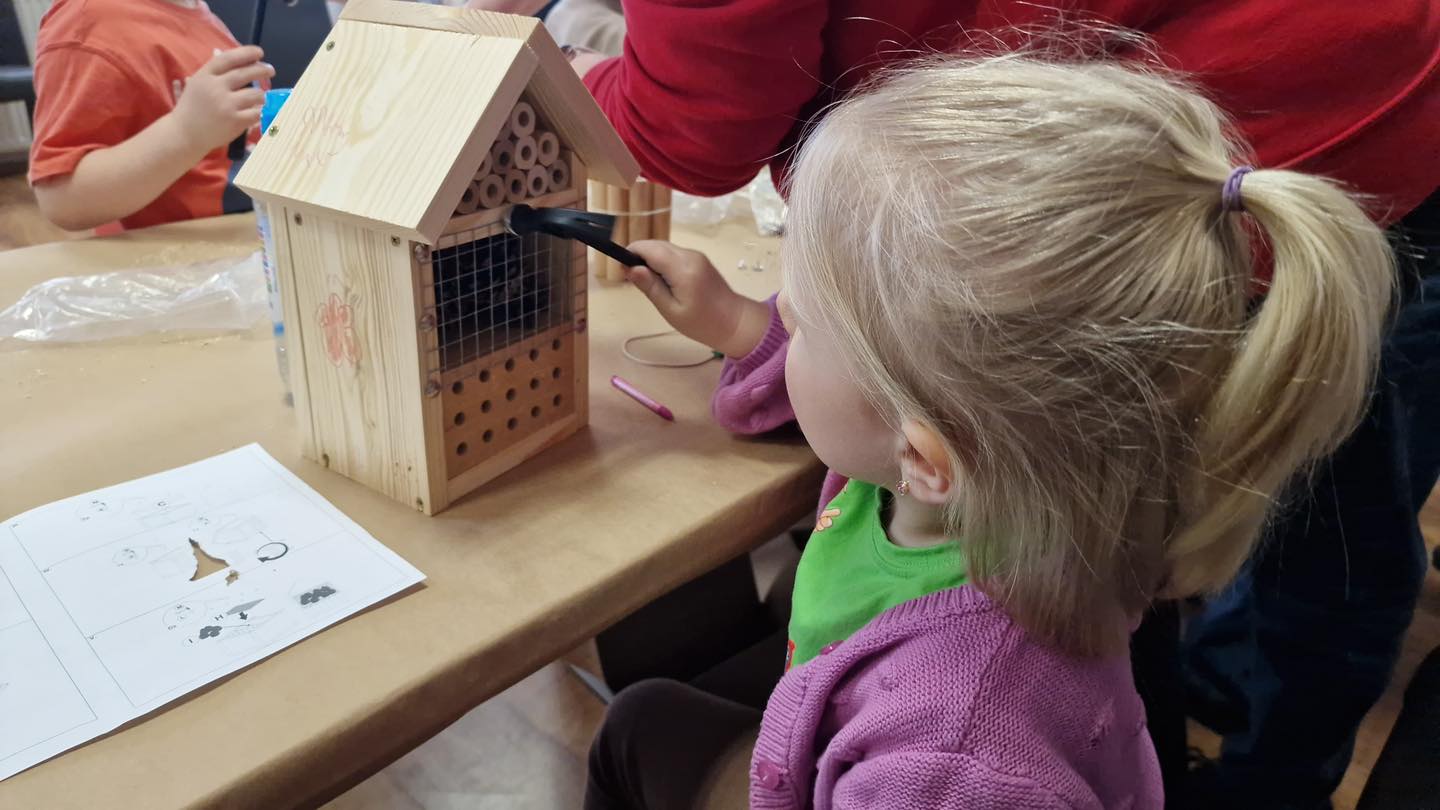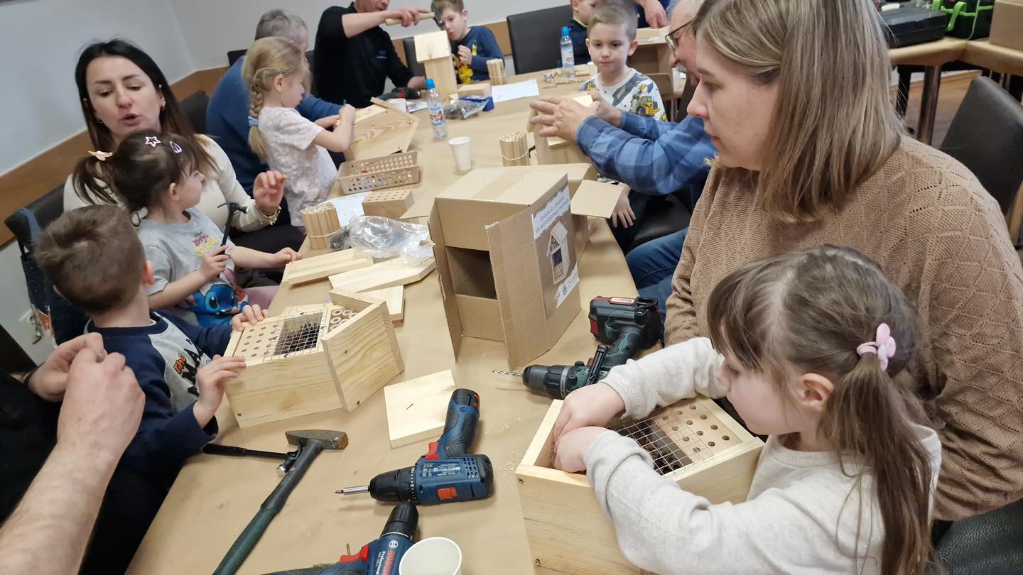 Po części teoretycznej przyszedł czas na działania praktyczne! Dzieci wraz z opiekunami z zaangażowaniem tworzyły domki dla owadów korzystając z narzędzi takich jak wiertarki, wkrętarki i młotki 🔨 . To była nie tylko świetna zabawa, ale też okazja do nauki nowych umiejętności. Powstałe domki zostały pięknie ozdobione i każdy mógł zabrać je do domu 🌿.