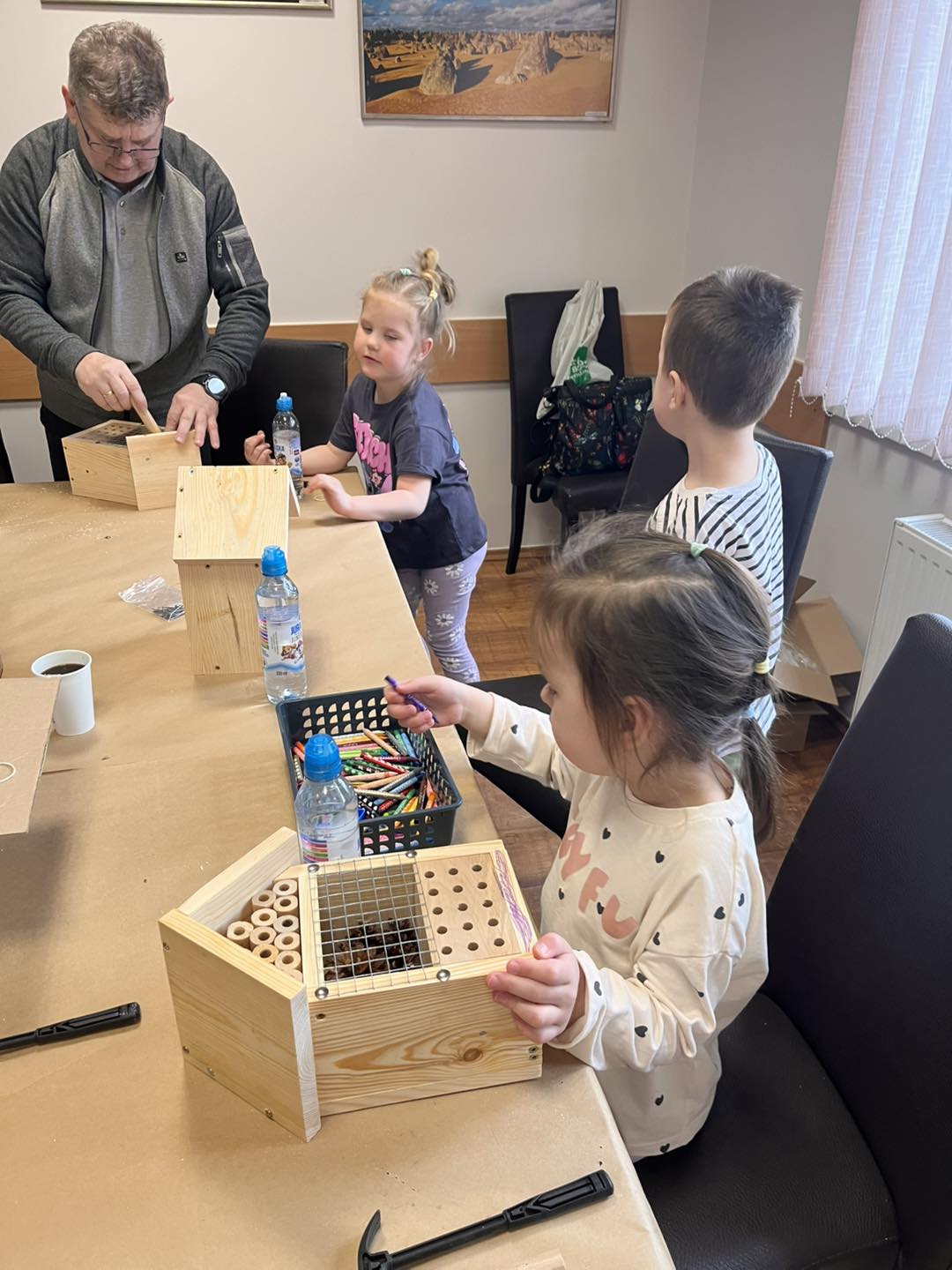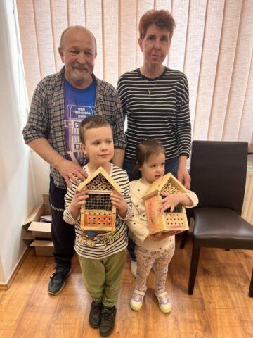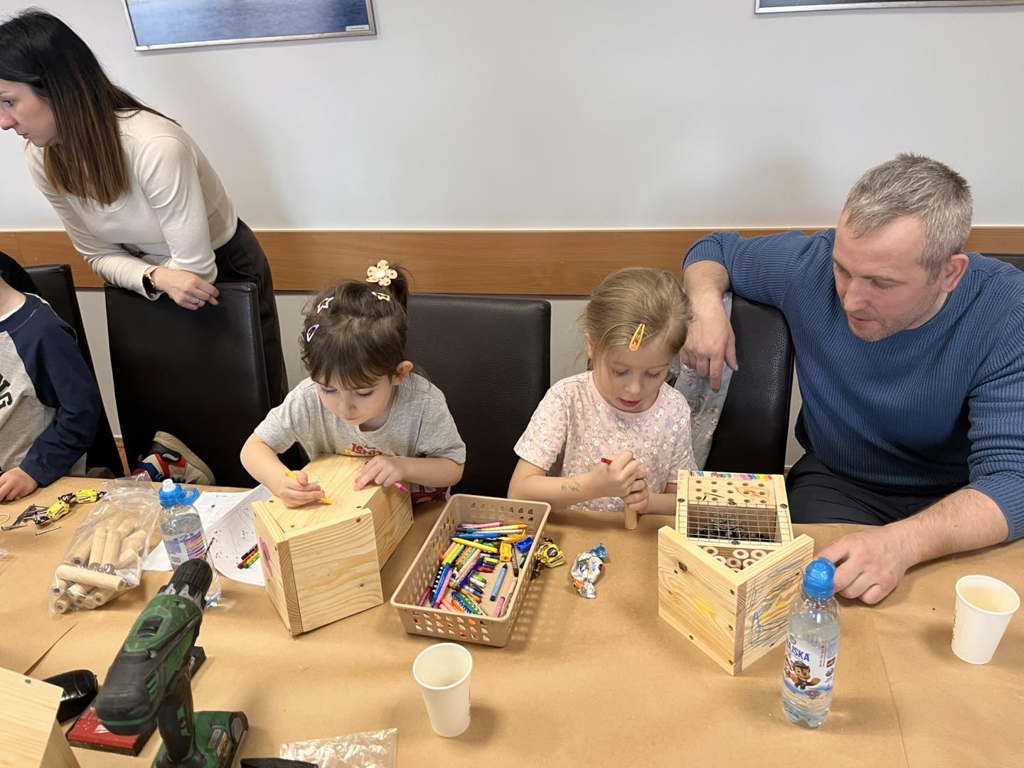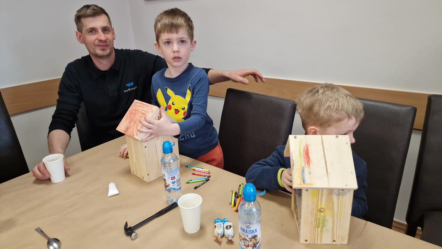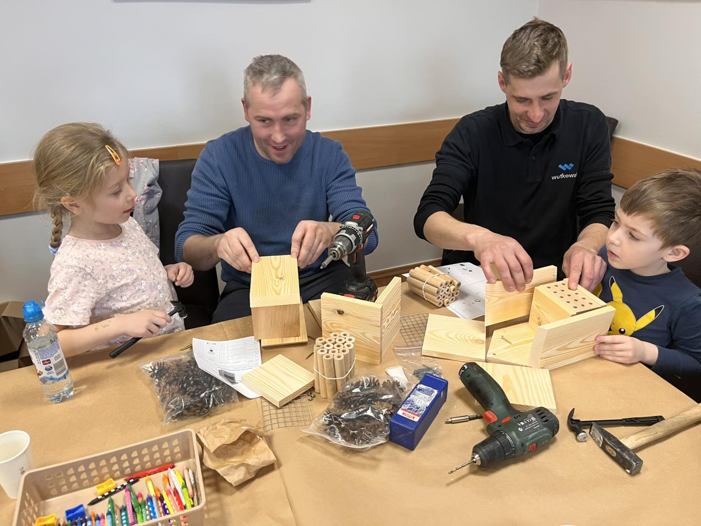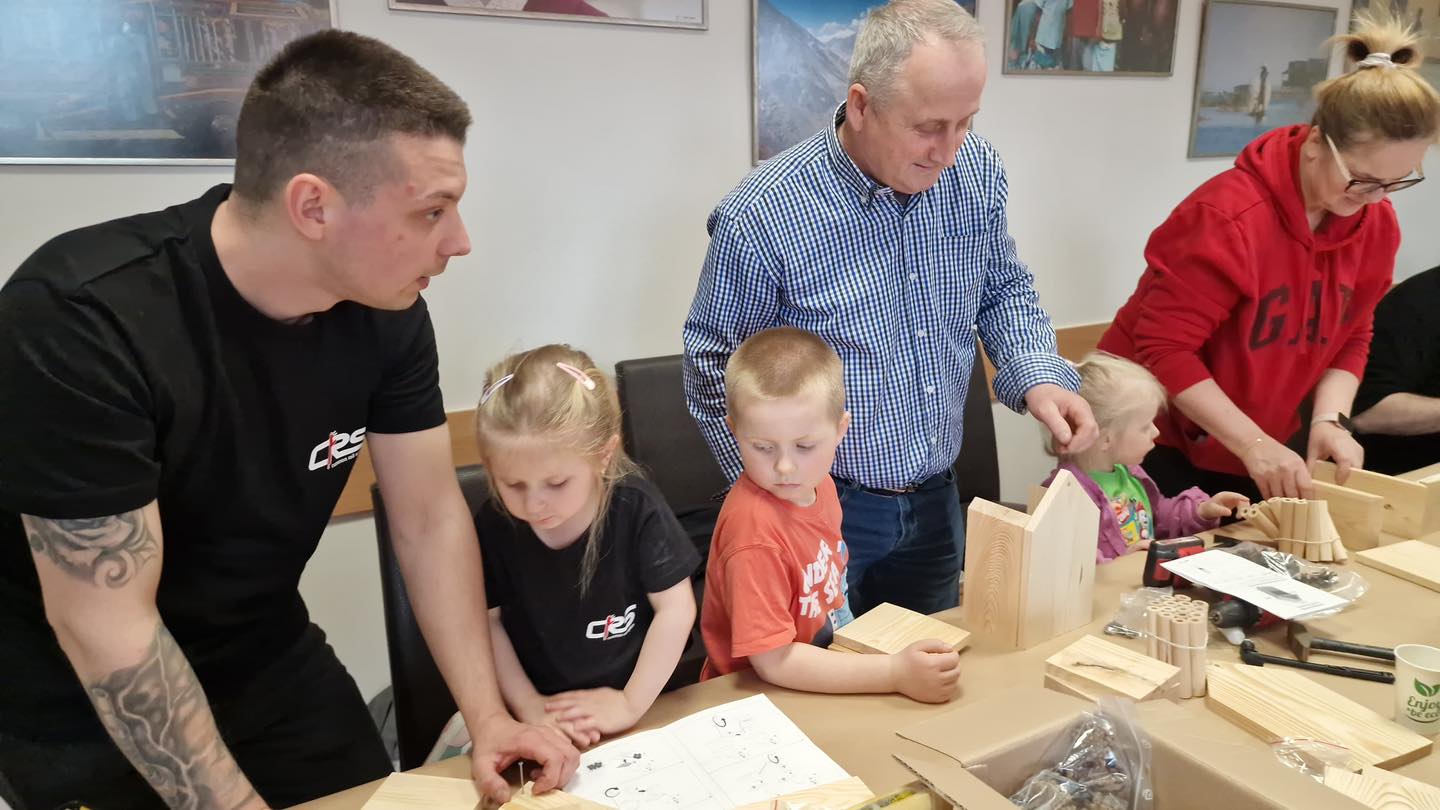 Po części teoretycznej przyszedł czas na działania praktyczne! Dzieci wraz z opiekunami z zaangażowaniem tworzyły domki dla owadów korzystając z narzędzi takich jak wiertarki, wkrętarki i młotki 🔨 . To była nie tylko świetna zabawa, ale też okazja do nauki nowych umiejętności. Powstałe domki zostały pięknie ozdobione i każdy mógł zabrać je do domu 🌿.