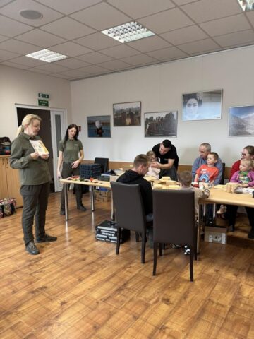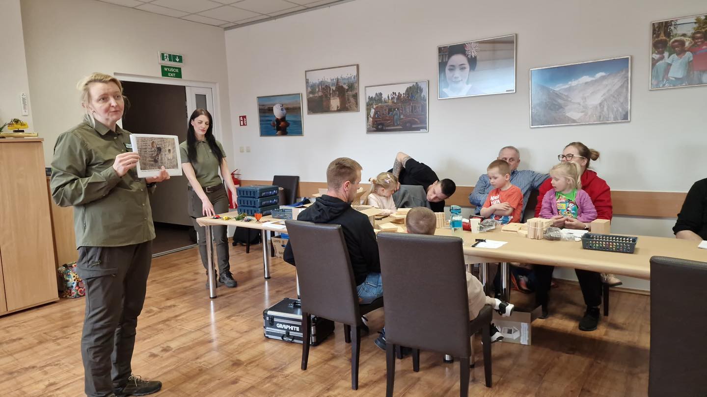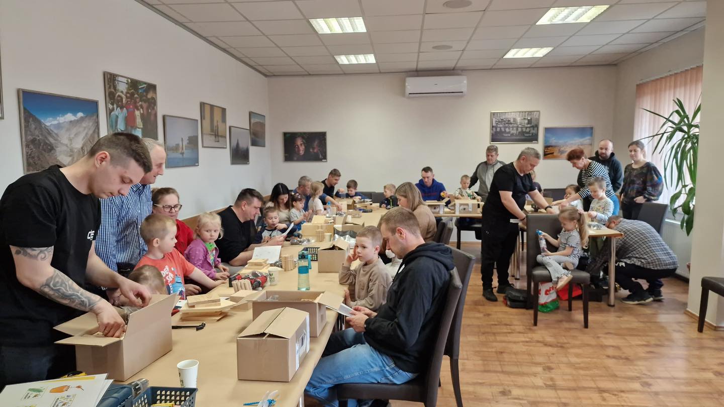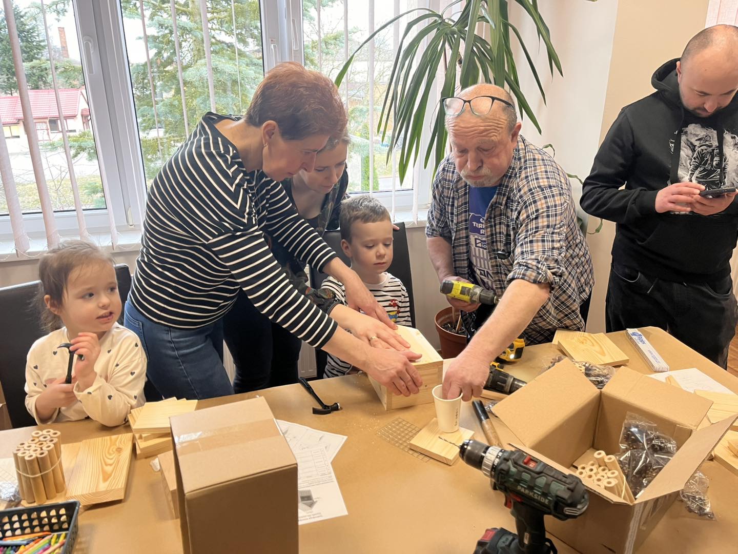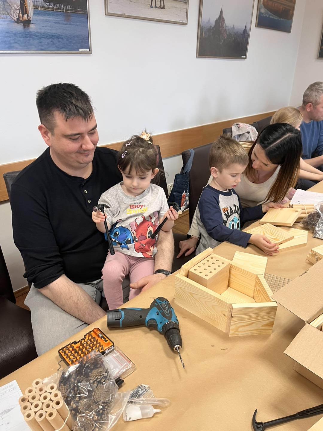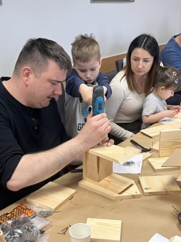 Po części teoretycznej przyszedł czas na działania praktyczne! Dzieci wraz z opiekunami z zaangażowaniem tworzyły domki dla owadów korzystając z narzędzi takich jak wiertarki, wkrętarki i młotki 🔨 . To była nie tylko świetna zabawa, ale też okazja do nauki nowych umiejętności. Powstałe domki zostały pięknie ozdobione i każdy mógł zabrać je do domu 🌿.