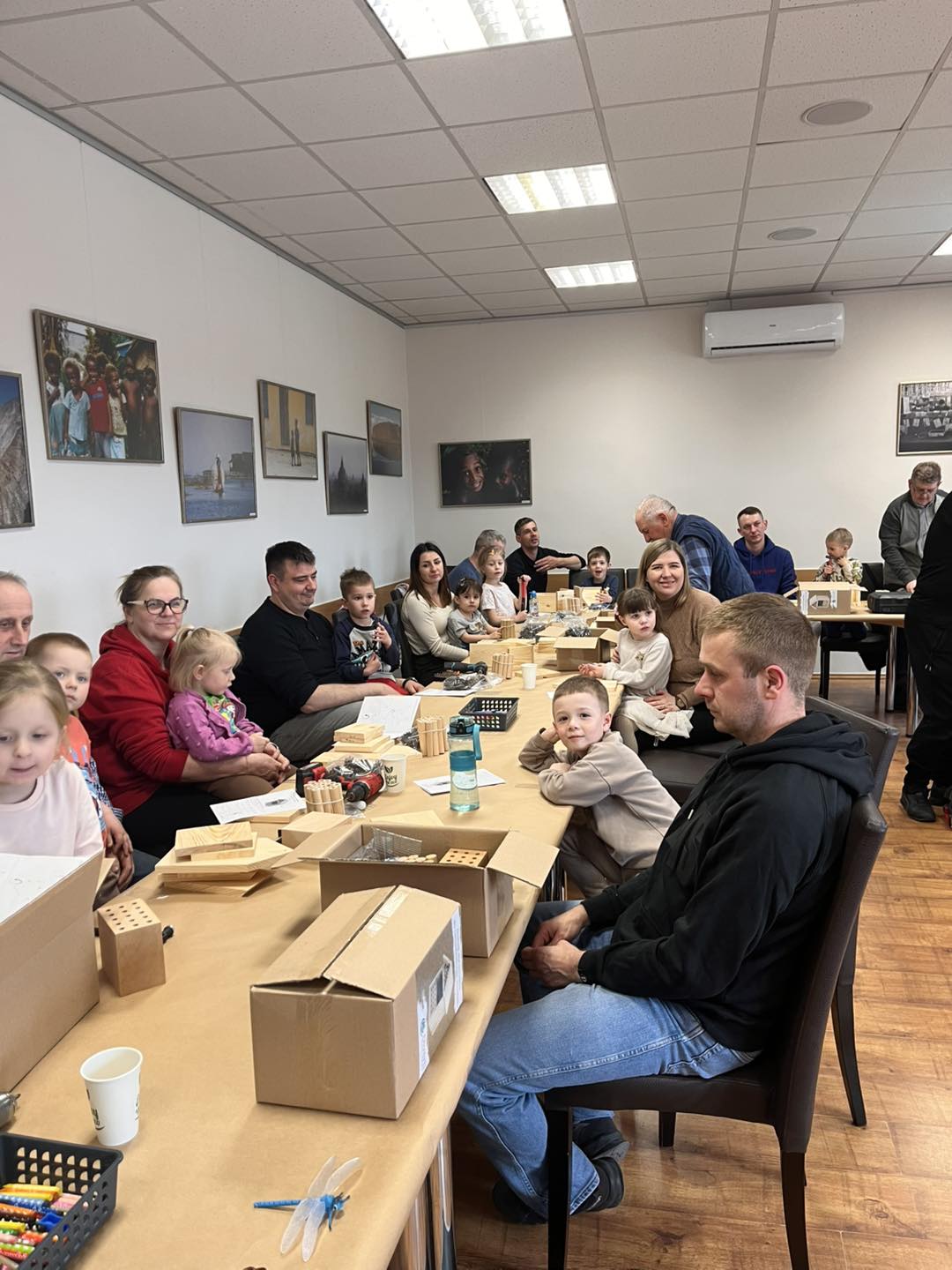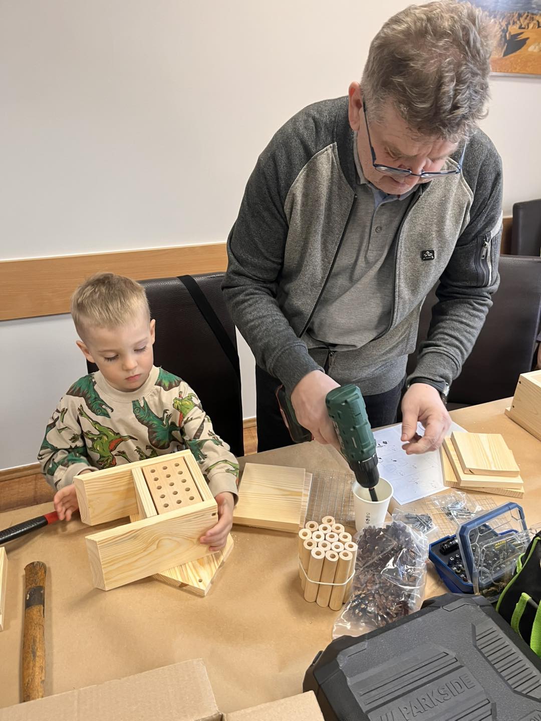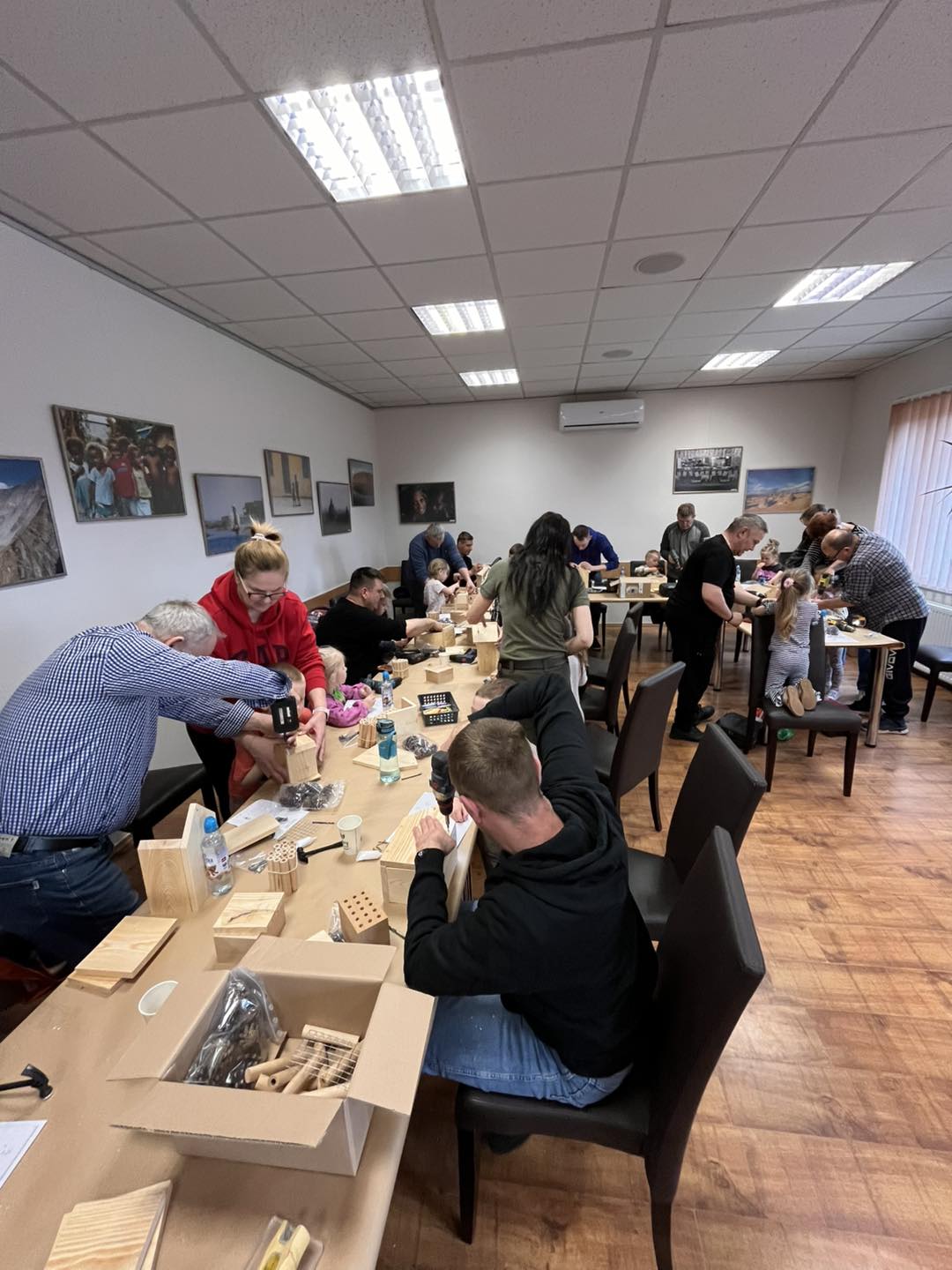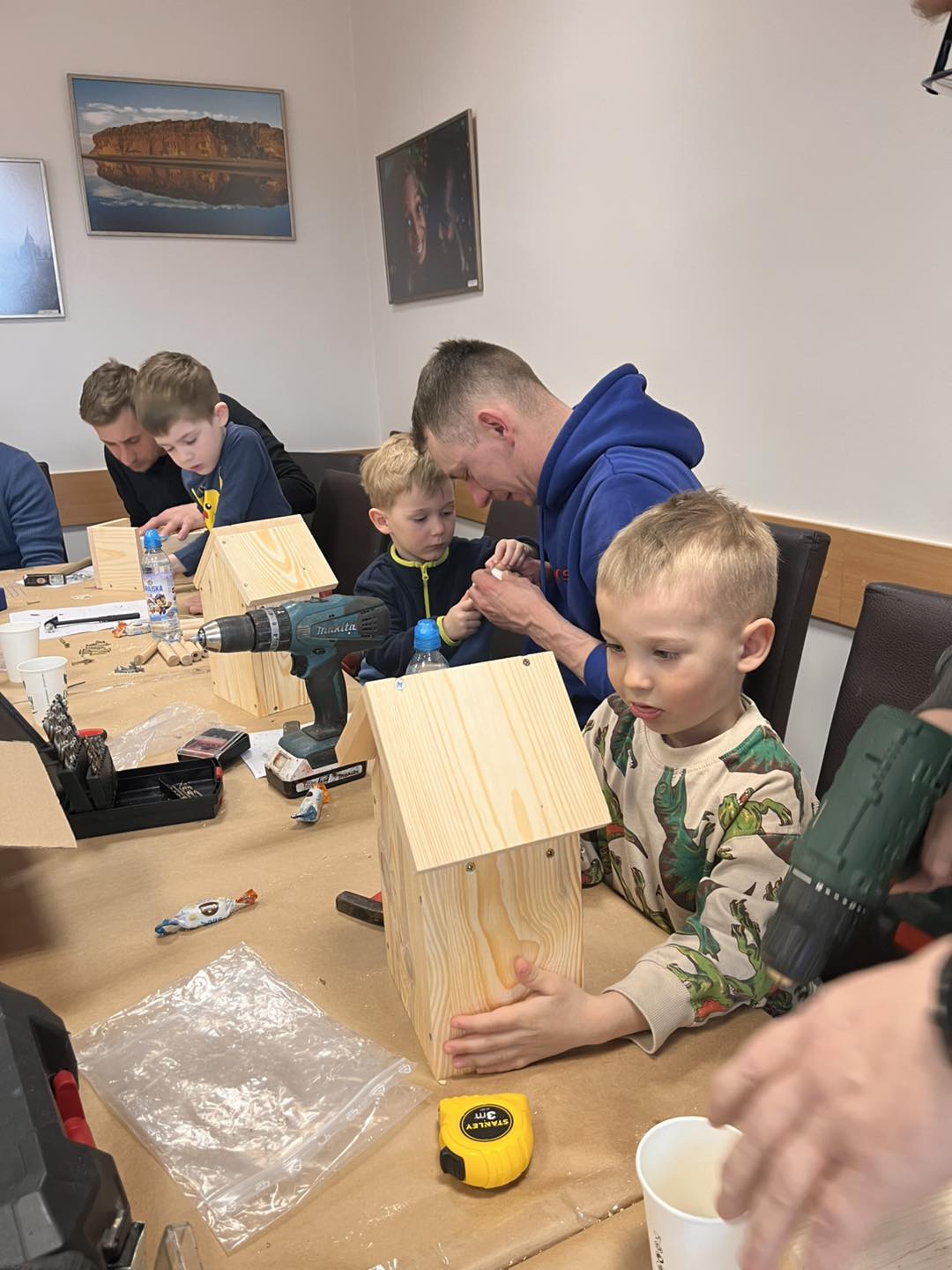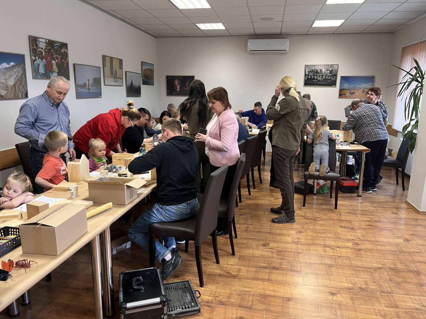 Po części teoretycznej przyszedł czas na działania praktyczne! Dzieci wraz z opiekunami z zaangażowaniem tworzyły domki dla owadów korzystając z narzędzi takich jak wiertarki, wkrętarki i młotki 🔨 . To była nie tylko świetna zabawa, ale też okazja do nauki nowych umiejętności. Powstałe domki zostały pięknie ozdobione i każdy mógł zabrać je do domu 🌿.