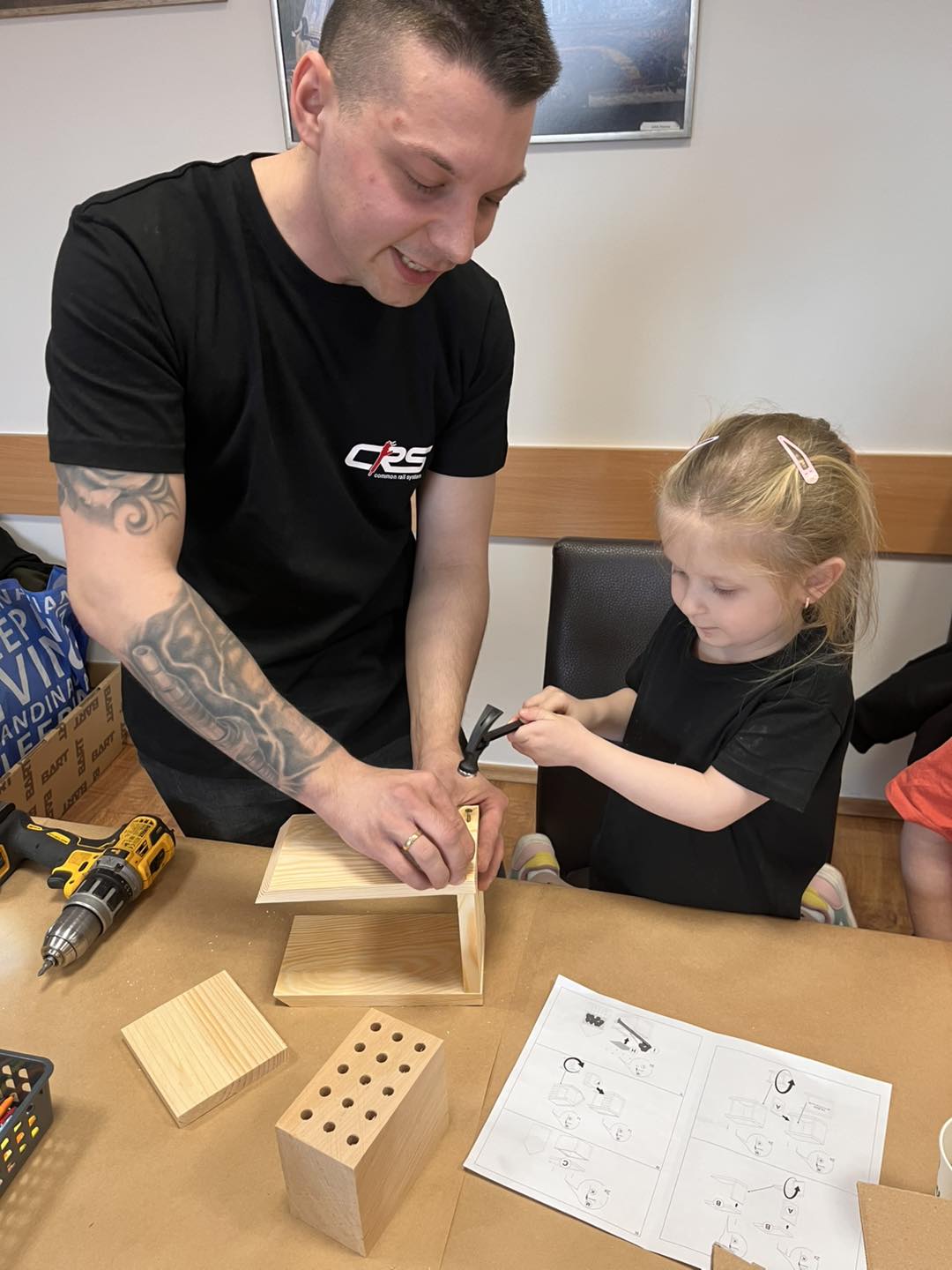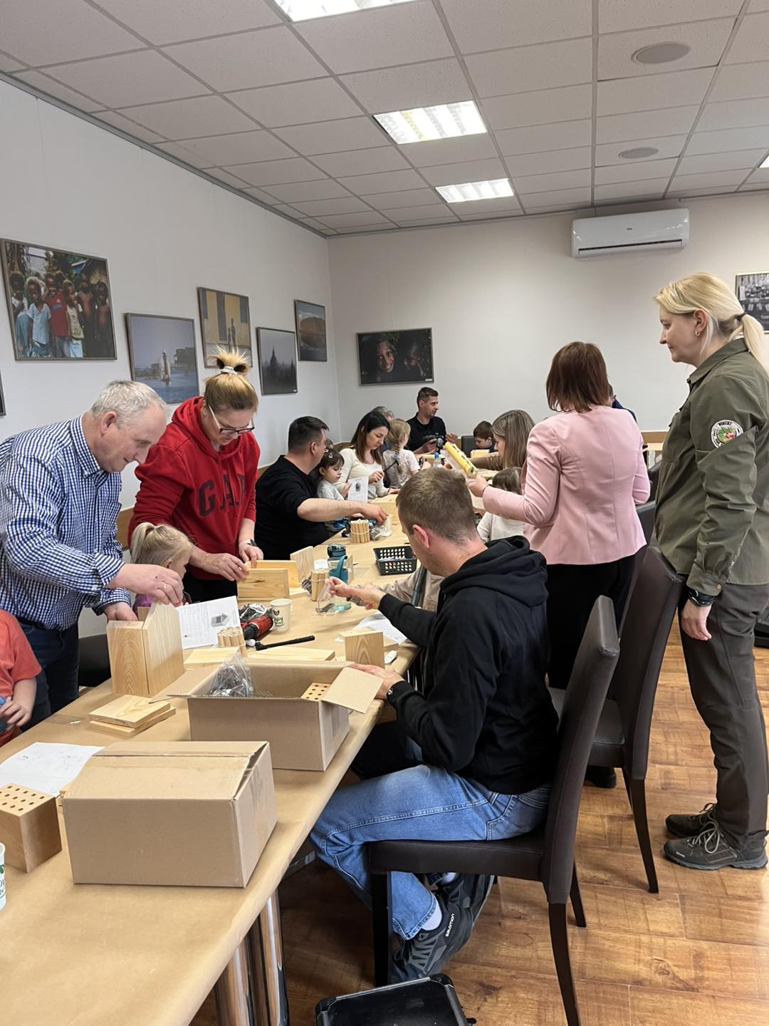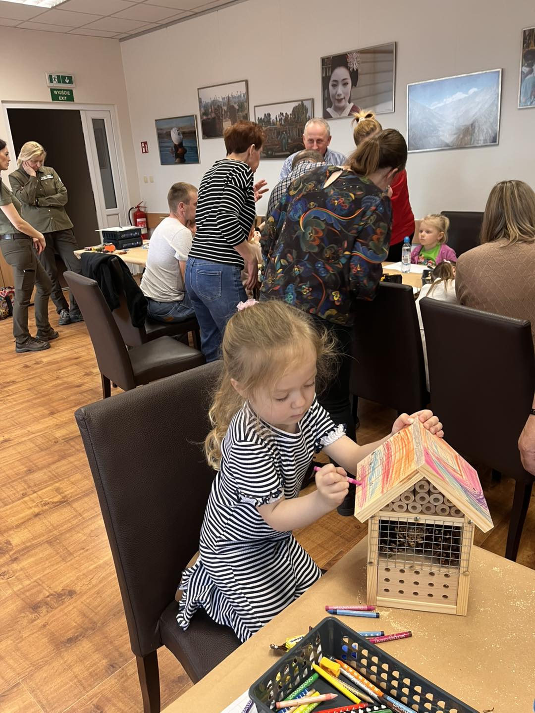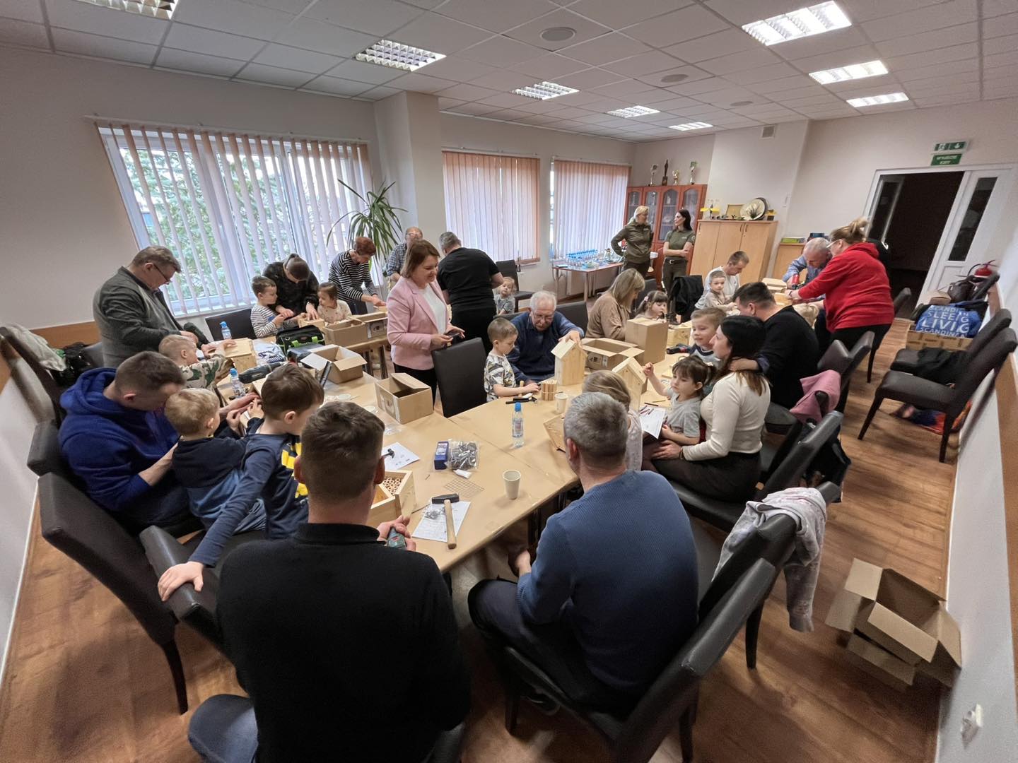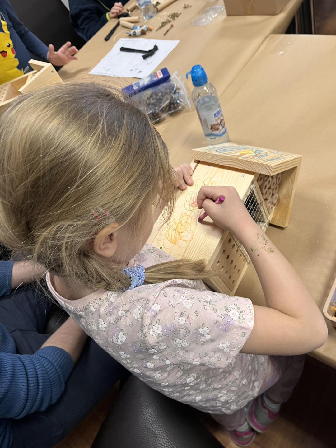 Po części teoretycznej przyszedł czas na działania praktyczne! Dzieci wraz z opiekunami z zaangażowaniem tworzyły domki dla owadów korzystając z narzędzi takich jak wiertarki, wkrętarki i młotki 🔨 . To była nie tylko świetna zabawa, ale też okazja do nauki nowych umiejętności. Powstałe domki zostały pięknie ozdobione i każdy mógł zabrać je do domu 🌿.