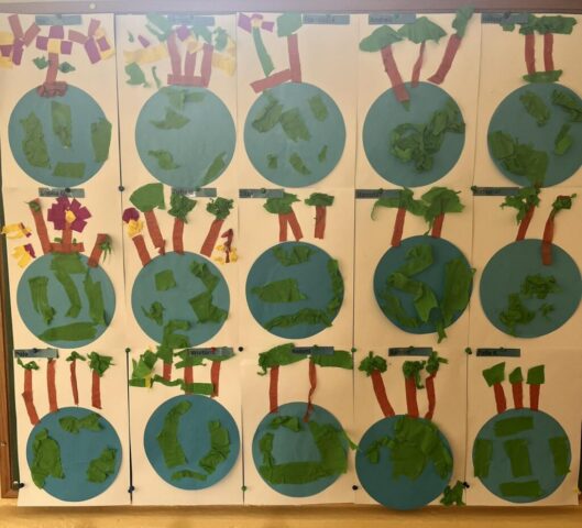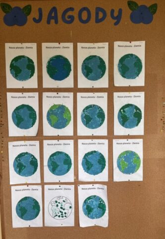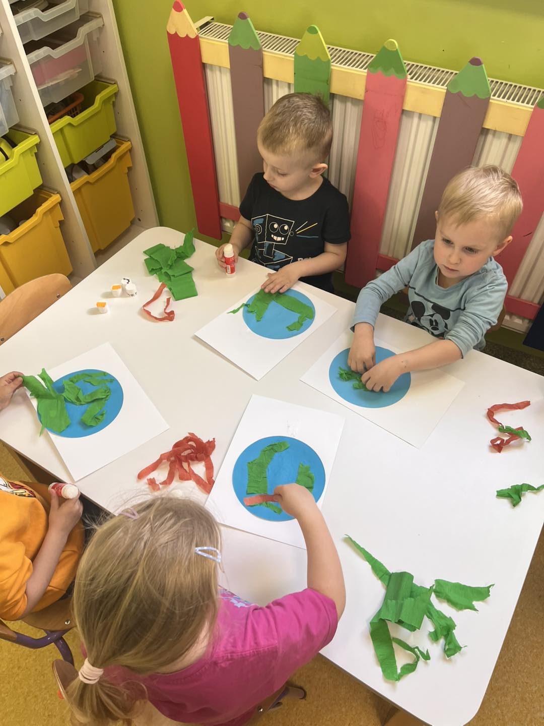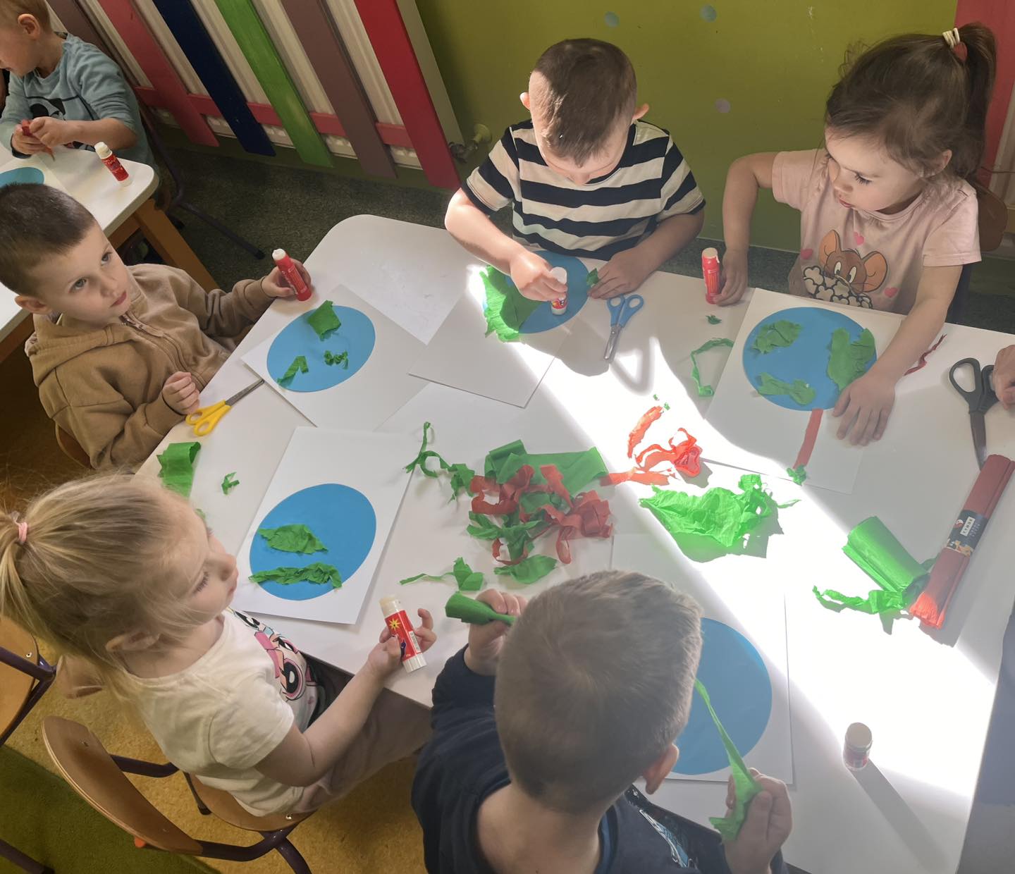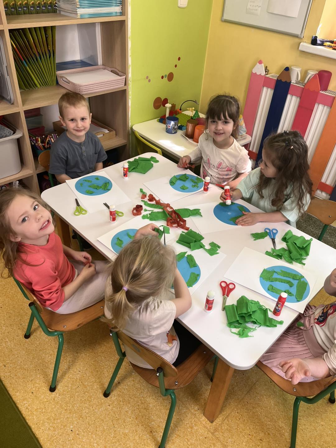 Przedszkolaki z ogromnym zaangażowaniem uczestniczyły również w zajęciach plastycznych, tworząc piękne prace inspirowane naszą Ziemią, naturą i troską o środowisko. Powstały kolorowe plakaty, rysunki i ekologiczne dzieła pełne dziecięcej wyobraźni. ![]()